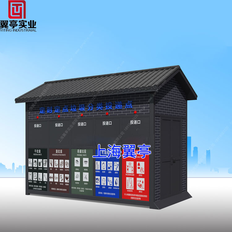 垃圾分類房介紹:一款純黑色小尺寸垃圾分類房投入市場使用。采用純黑色的垃圾房并不多見,但是我們上海翼亭垃圾房廠家爭取給大家更多與眾不同的垃圾分類房款式參考和選擇。這款純黑色垃圾分類房前面設置了5個垃圾投放窗口,側面開門,方便垃圾桶以及工作人員進出。垃圾分類房的頂部更是采用了琉璃瓦,不但實用也為整個垃圾房增添光彩!
